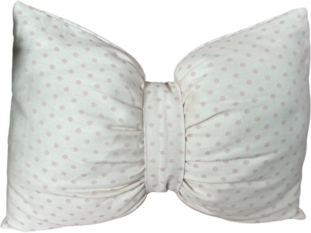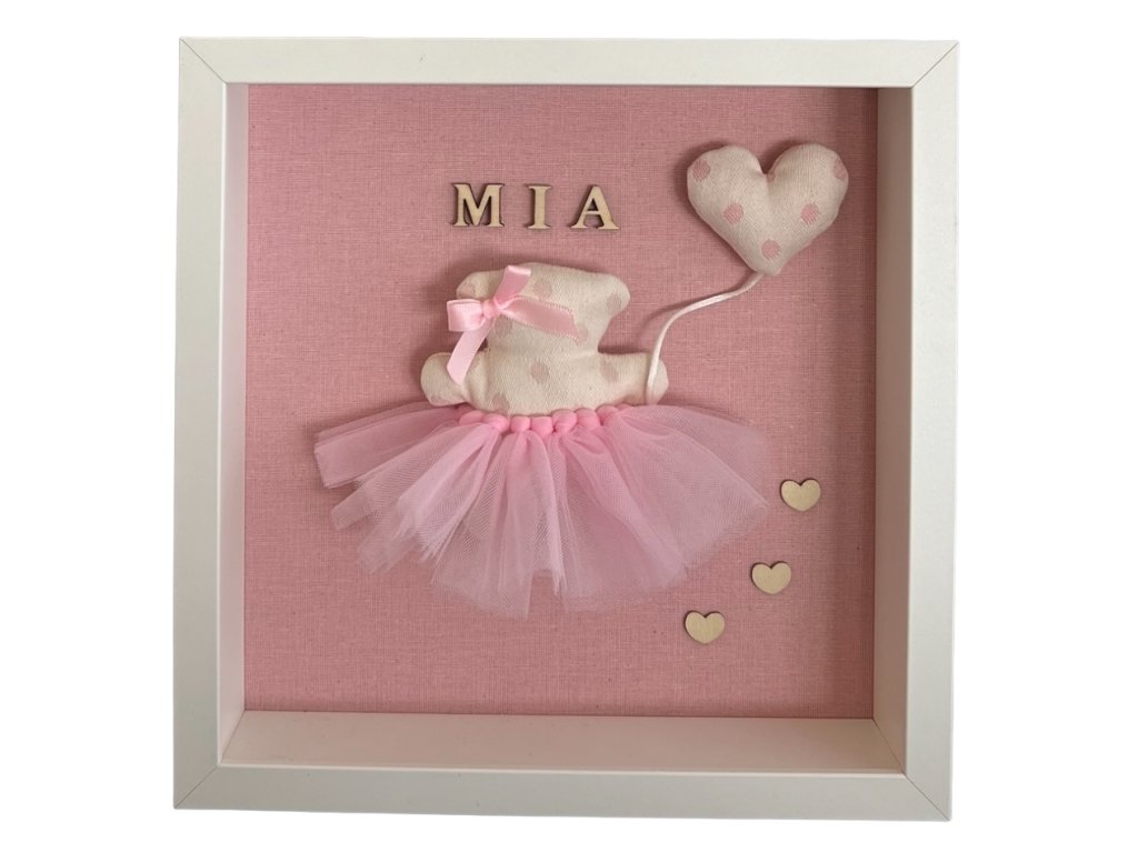 Polštář z kolekce růžových puntíků, který lze kombinovat s rámečkem, ve kterém je medvídek ze stejné látky.